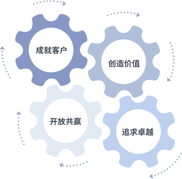 成就客户是一切决策的出发点,,,,创造价值是衡量所有工作的标准,,,追求卓越是我们做事做人的态度,,开放共赢是我们的格局也是最终的结果。。。价值观的齿轮环环相扣,,,推动着组织里的每个人不断向前。。。。